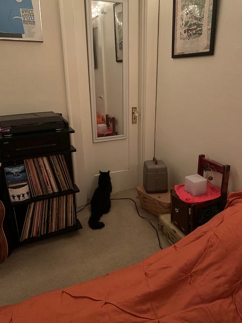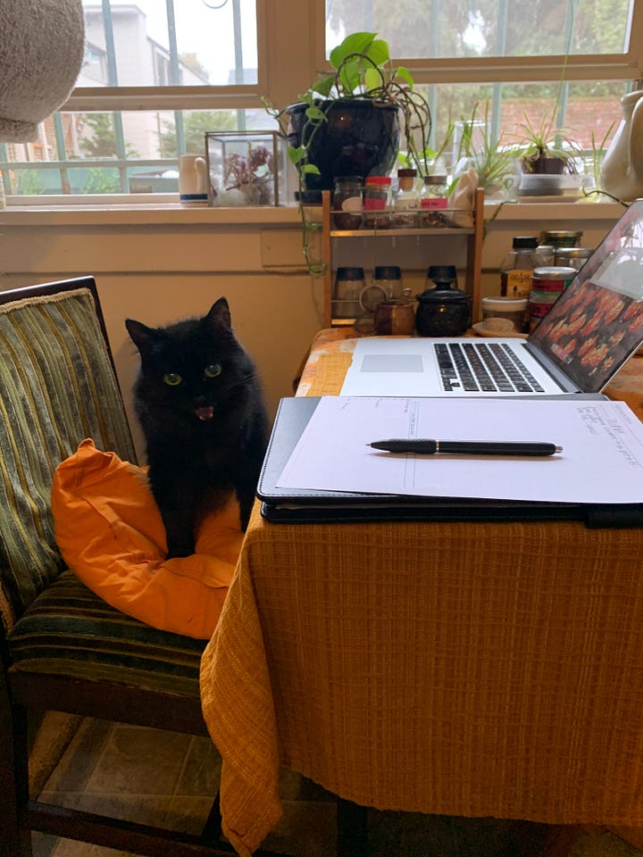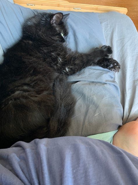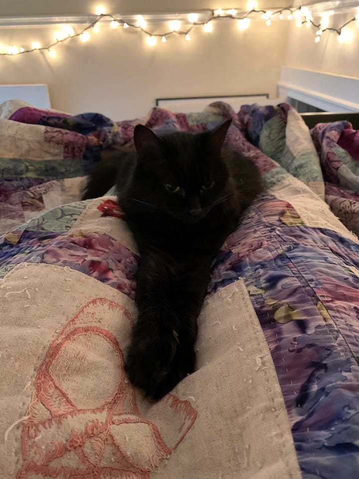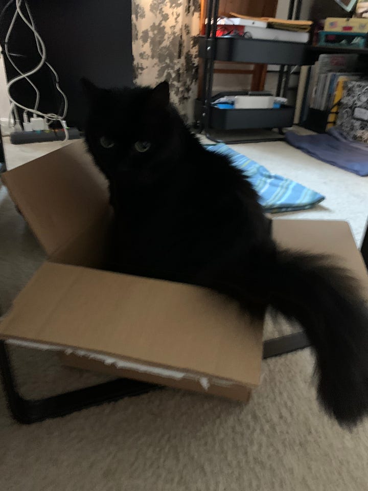 I’ve created a photo album for her previous owner that I share with all of you. It took me several weeks to go through everything, but it features my favorite photos and videos that I took of here over the years, including some that were shared by friends. Since she was of the “Void Cat” species, sometimes she’s hard to spot, but I promise that she’s in every photo I’ve selected. I took many pictures of her when we first got together and she used to sit on my lap more in the chilliness of our basement apartment. There are so many videos of me trying to understand what she was doing, often prompted by her meowing out of nowhere (rarely captured on film). Some of my favorites are when we visited Whidbey Island and the pictures from a photoshoot my sister Priscilla generously gifted me. It concludes with her final moments and what remains of her.