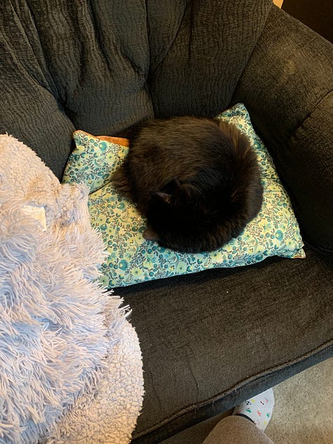 Eventually I changed jobs and started a new education journey and Coco continued to slow down. There would be a dramatic burst that prompted me to call the vet, a series of tests, and then a newly adjusted equilibrium. She’d spend most of her days sleeping, often taking my spot on the bed after I finished getting up. She still screeched for food and insisted I go to bed around 11 pm (I just had to be in bed, not necessarily asleep). Earlier this year, we were gifted a tremendously glorious heated pillow that responded to her weight so she didn’t overheat, and she basically lived in it for hours at a time, sleeping the day and night away.